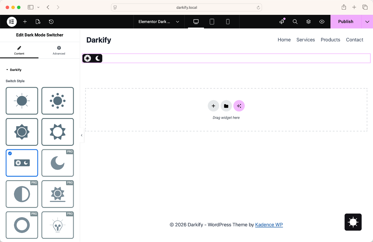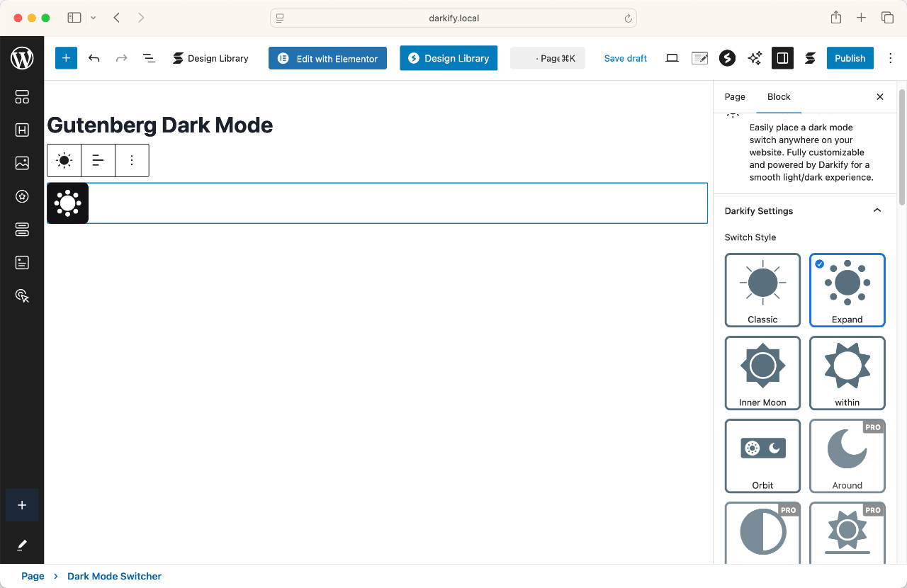 Shortcode Switch: Place the dark mode toggle anywhere on the site using a shortcode, including pages, posts, widgets, or templates.
