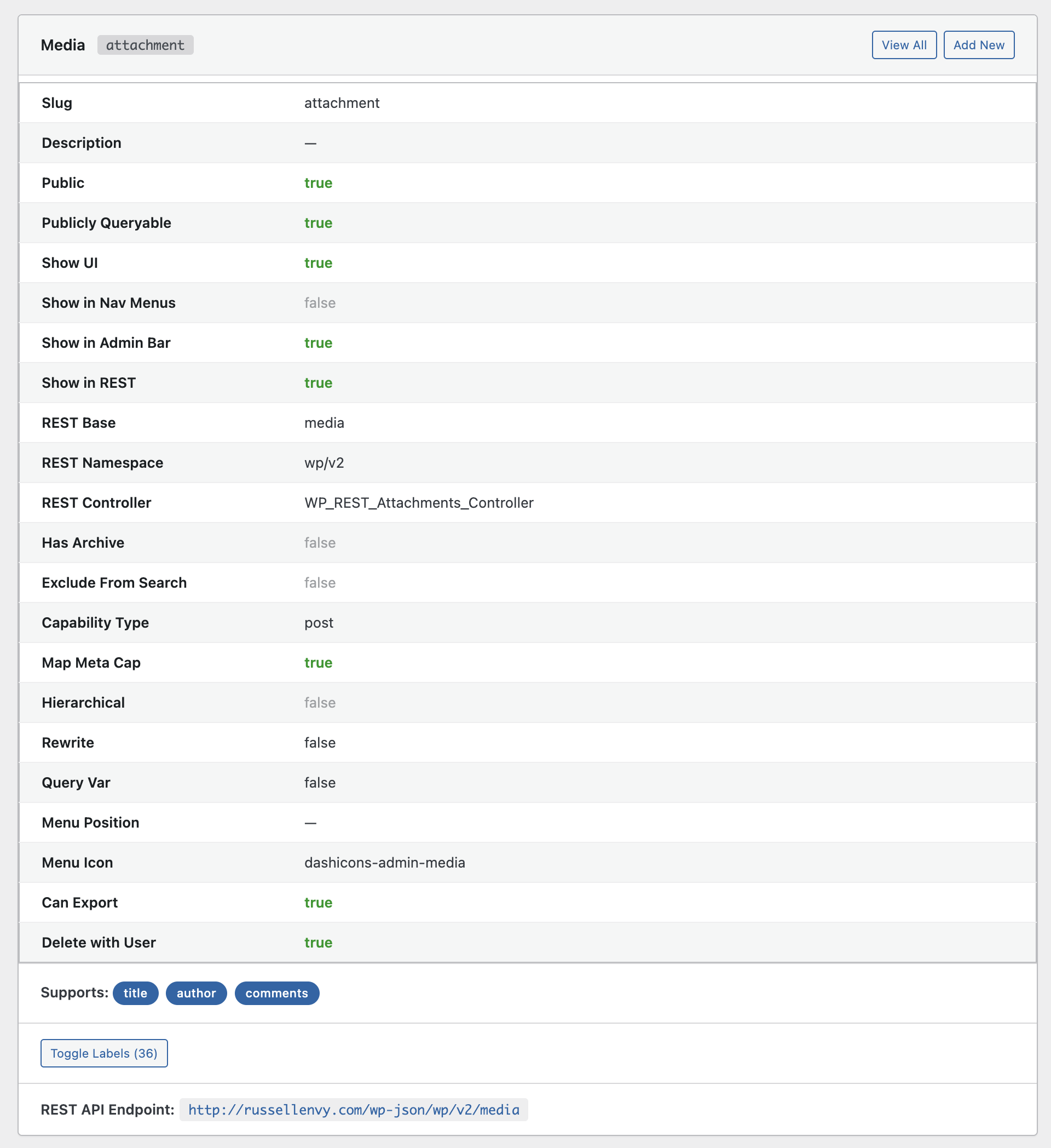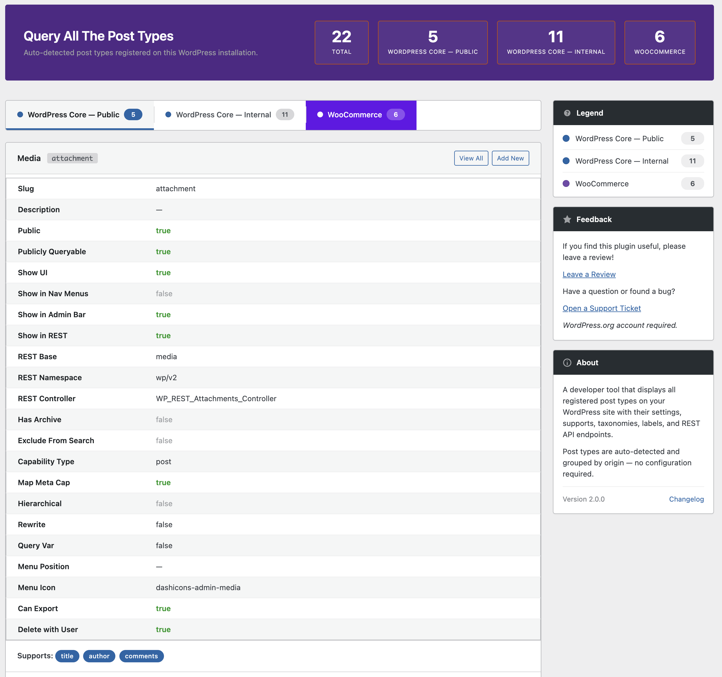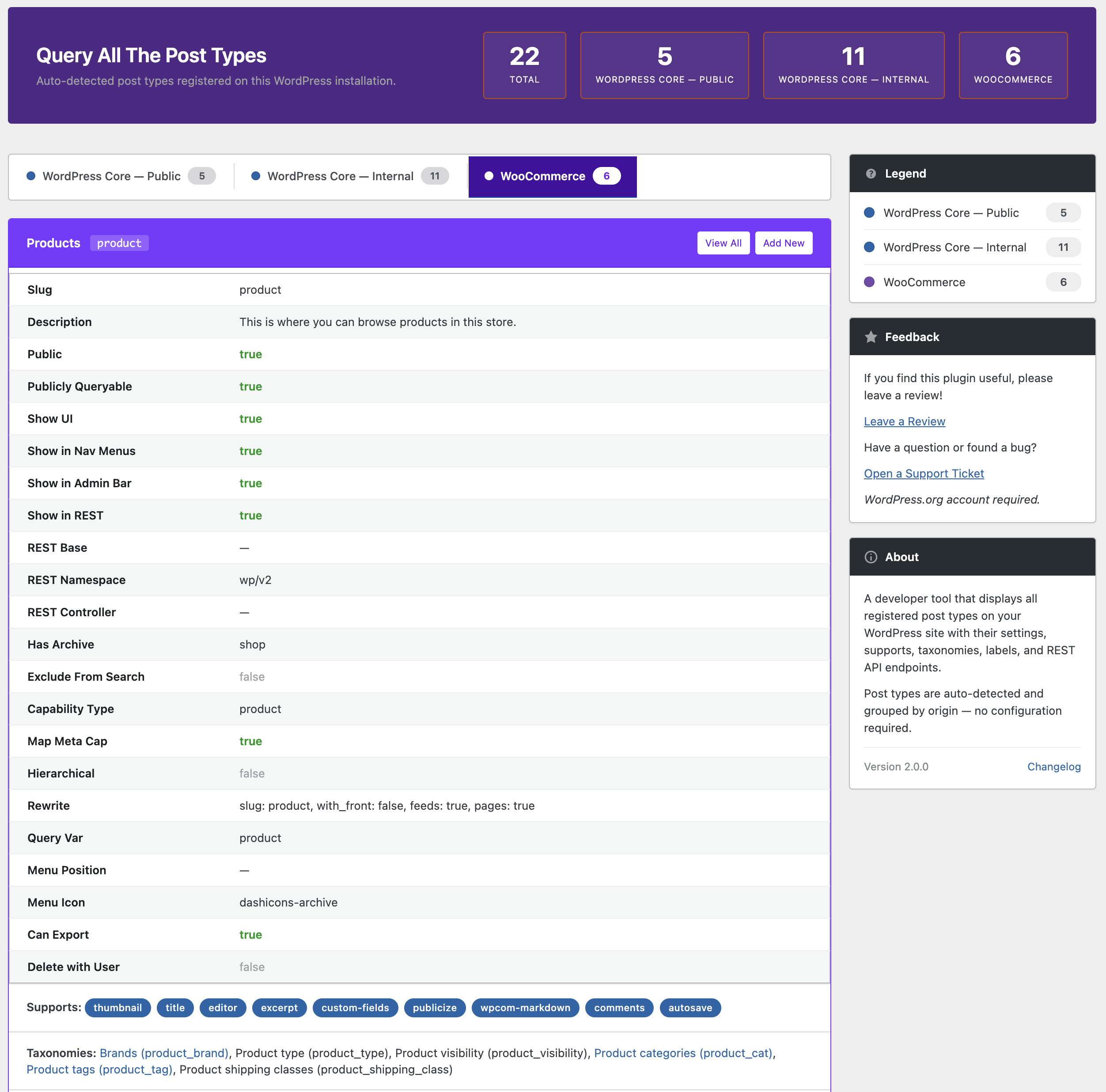 - Comprehensive Data — View all registration settings, REST API config, supports, taxonomies, and labels