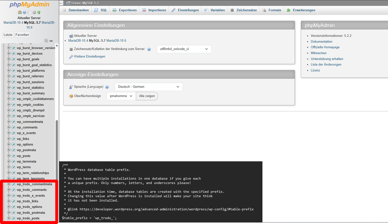 ich habe eine frische WordPress Installation zu einer bereits bestehenden SQL-Datenbank hinzugefügt. Dazu habe ich den Präfix statt „wp_“ zu „wp_trodo_“ geändert. Die Ausgabe aus dem Debugmodus sieht wie folgt aus: