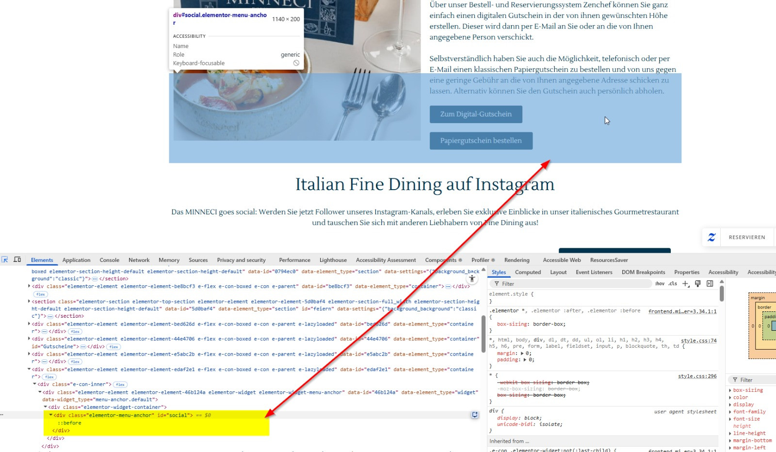 Sobald ich einen Anker setze, überdeckt dieser die darüber liegenden Container; in meinem Fall hatte ein Anker für FAQ das Kontaktformular verdeckt und der Anker für Social die Buttons für die Gutscheine.