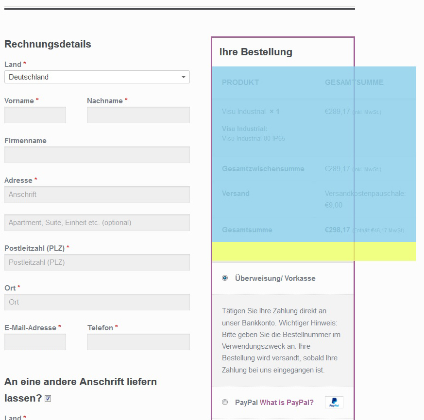 Da ich mein Problem nur mit dem Storefront Theme und nicht mit den Standard Themes hab, bin ich hier hoffendlich richtig. Falls nicht bitte ich einen Mod den Post in den richtigen Bereich zu verschieben 🙂Ich habe mit WooCommerce einen Shop aufgebaut und benutze dazu die Storefront-Theme. Leider hab ich das Problem, die Zahlungsinformationen bei der Kassenübersicht die dafür vorgesehene Box überschreiten. (s. Bild – Ich hab den Bereich um den es geht blau markiert)