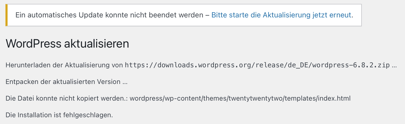 Und ich kann manche Websites manuell nicht auf WordPress 6.8.2 aktualisieren, ich bekomme beim Aktualisieren im Backend einen Fehler. Bei manchen verlief die Aktualisierung problemlos.
