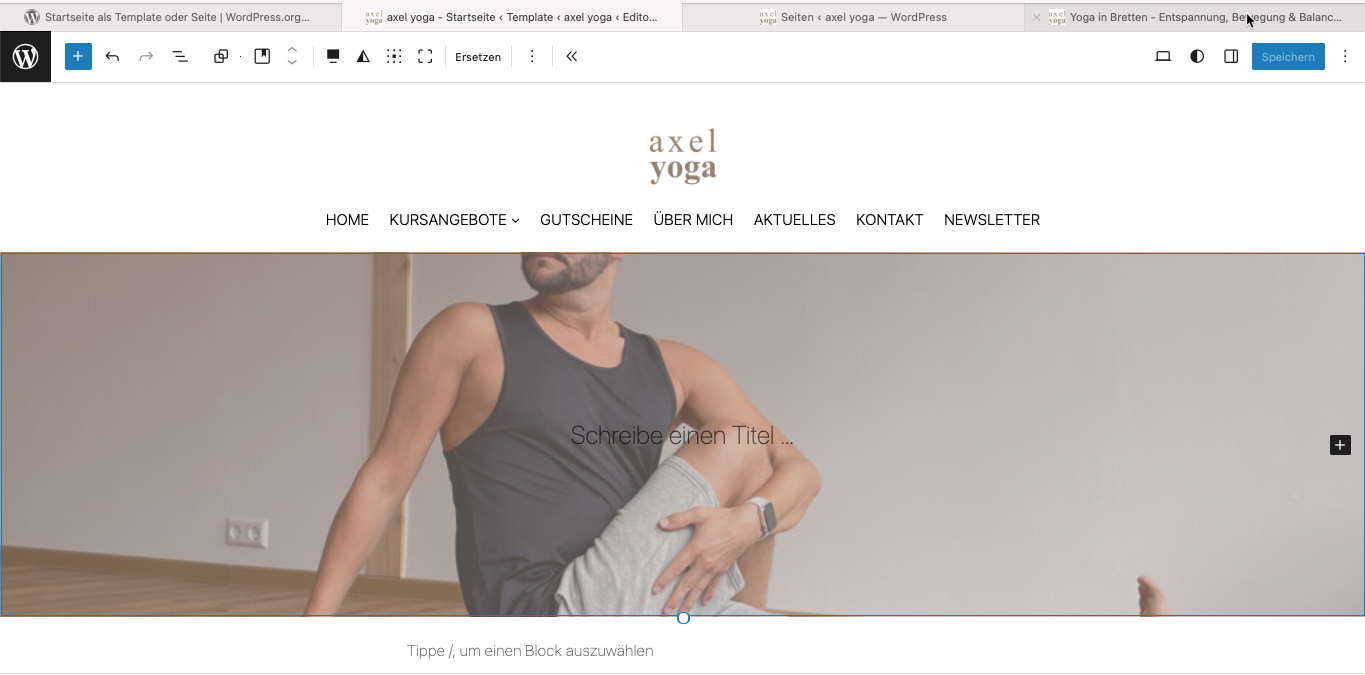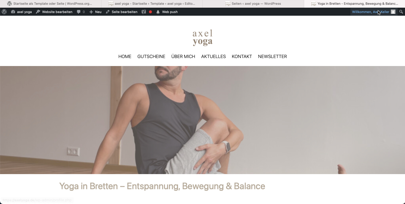 Ich habe dann das alte Startseiten-Template gelöscht, um das neue Template als Startseiten-Template verwenden zu können. Der Grund warum das jetzige verknüpfte Template auch Startseite lautet, ist der, dass ich es selbst umbenannt habe in axel yoga-Startseite.